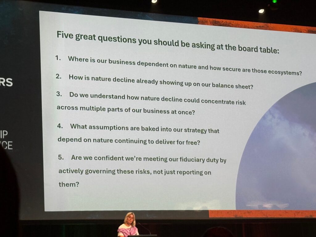 Izzy Fenwick shared about Nature as Business, asking us to imagine our long term value relies on a single supplier … Nature. As Nature provides water, land, air. We have wrongly treated nature as a free supplier. But now climate change is impacting nature – so you need to update risk register, lift capability, demand data and start talking. Not many do this well – could your board?